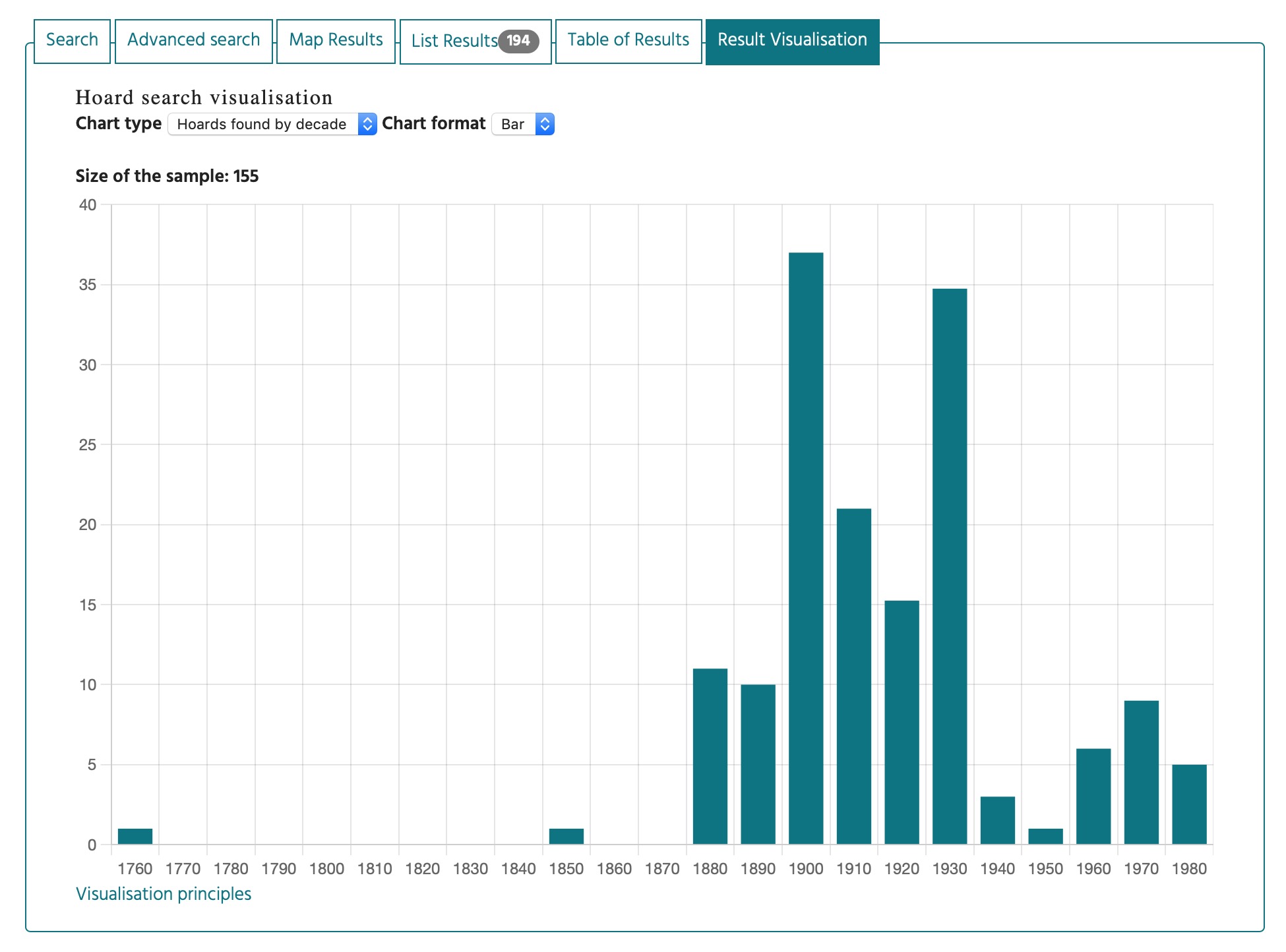As part of a web development that took place in several phases from October 2022 to October 2023, we have improved some of our search functionalities, introduced map searches, and deployed a set of map and chart visualisations pertaining to (a) individual hoards, (b) a number of queries able to interrogate results across our dataset, and (c) 'Coins per date of minting' histograms: