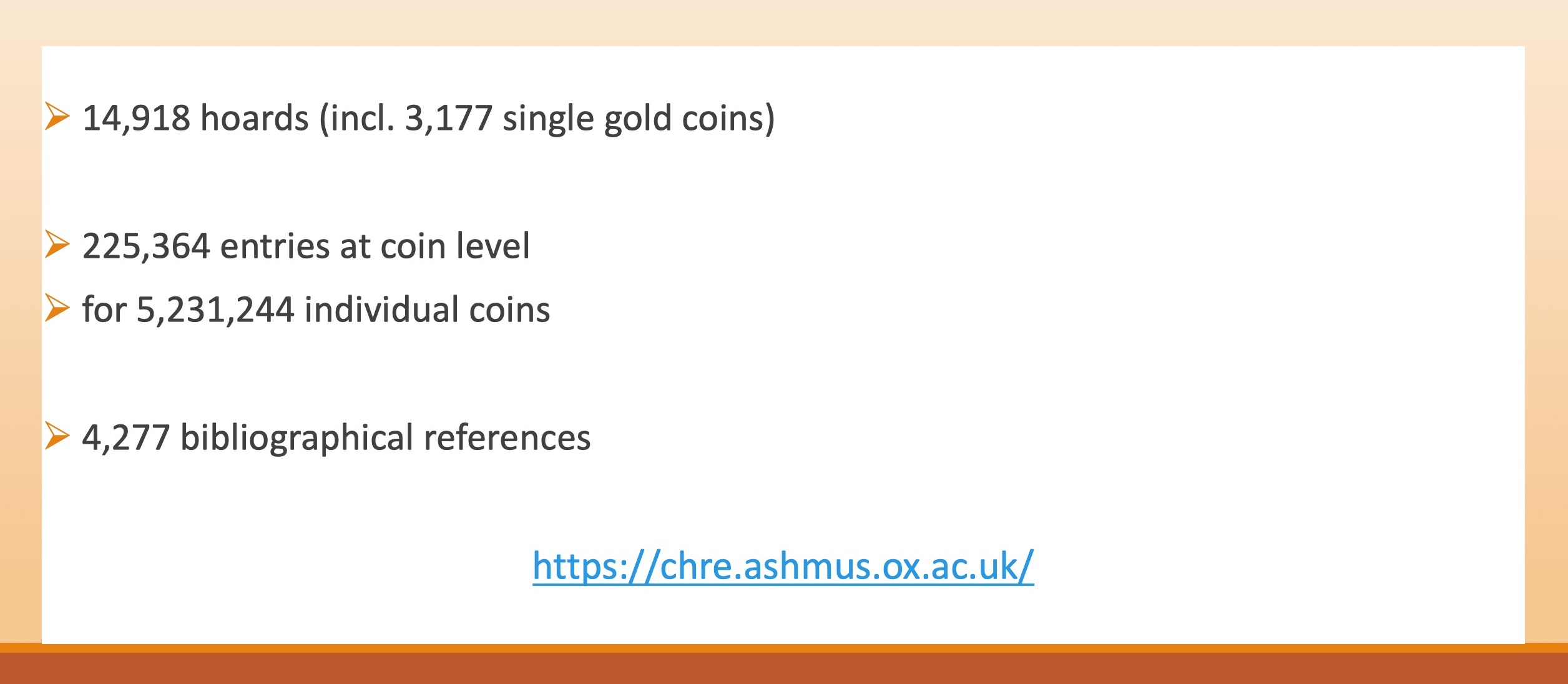 As of today, we have collected information on nearly 15,000 hoards both from within and outside the Roman Empire, amounting to more than 5 million individual coins and over 4000 bibliographical references: