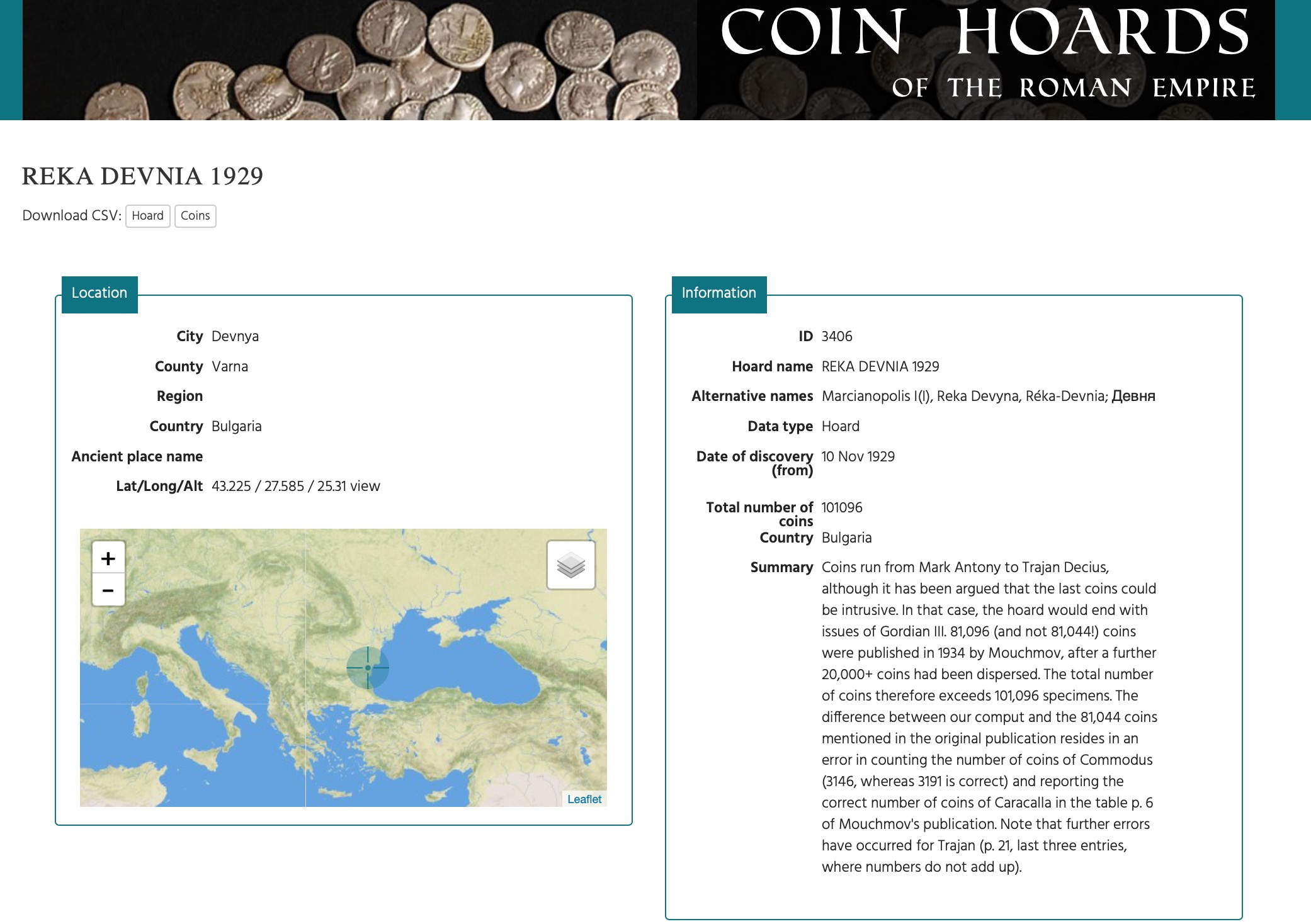 The first phase of the project (2013-18) focussed on collecting summary hoard data from all Roman provinces, as well as inputting a selection of hoards at the level of the individual coin. The current second phase (2019-23) aims to complete geographical coverage and to undertake the daunting task of systematically recording hoards at the level of the coin (including RIC numbers and full descriptions), where such data are available.