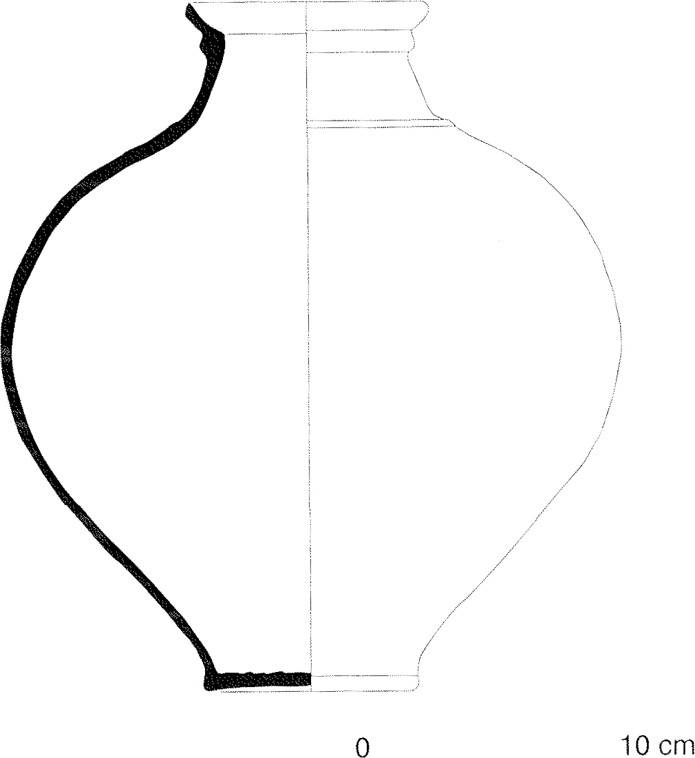 Height: 26 cm; Diamter max.: 24cm. The neck of tronconic shape, is surmounted by a concave oblique lip outlined on the outside by a bead. A small molding emphasizes the transition between the belly and the neck. Fine orange paste (Munsell SYR7 / 6). It contains small nodules of iron oxides and rare inclusions of very fine grains of silica as well as some coarser grains of 1 mm. This is a product of an unidentified workshop, certainly local or regional.