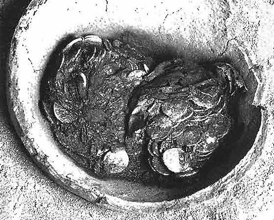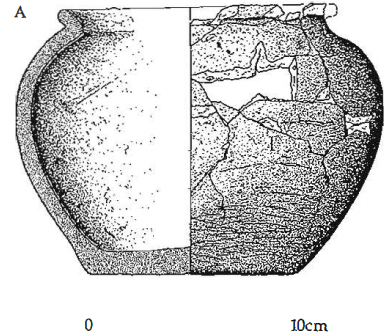 Roman Iron Age globular jar with everted rim. The coins were contained within two fairly well preserved leather bags, one containing 160 denarii and the other 150. (Holmes 2006, 2, fig. 2a.)