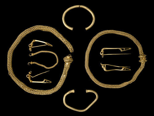 The gold torc is made of interlinked wire rings. The terminal is a cylinder decorated with two ornate collars. The terminal is decorated with 4 clustered gold granulations on one side and three filigree figure-of-8 motifs on the other. L 440 mm. Ext D 148 mm