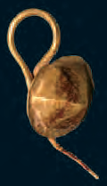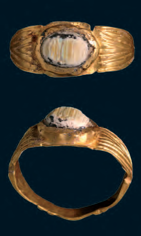 Ring with bezzel. Flat elliptical closed rod with rounded sides that widen towards the bezel. Decoration on the upper half with a wide band, motif with 5 concentric triangles engraved on the two sides of the ring; lower half decorated with stylized biconical pearls motif. Oval raised bezel with a flat base of convex type paste, imitation of a chalcedony niccolo.