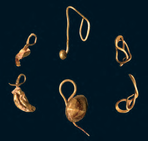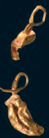 Gold earring. Double-curve suspension hook on smooth wire, to which a circular base plate of a hexagonal pyramid is welded.