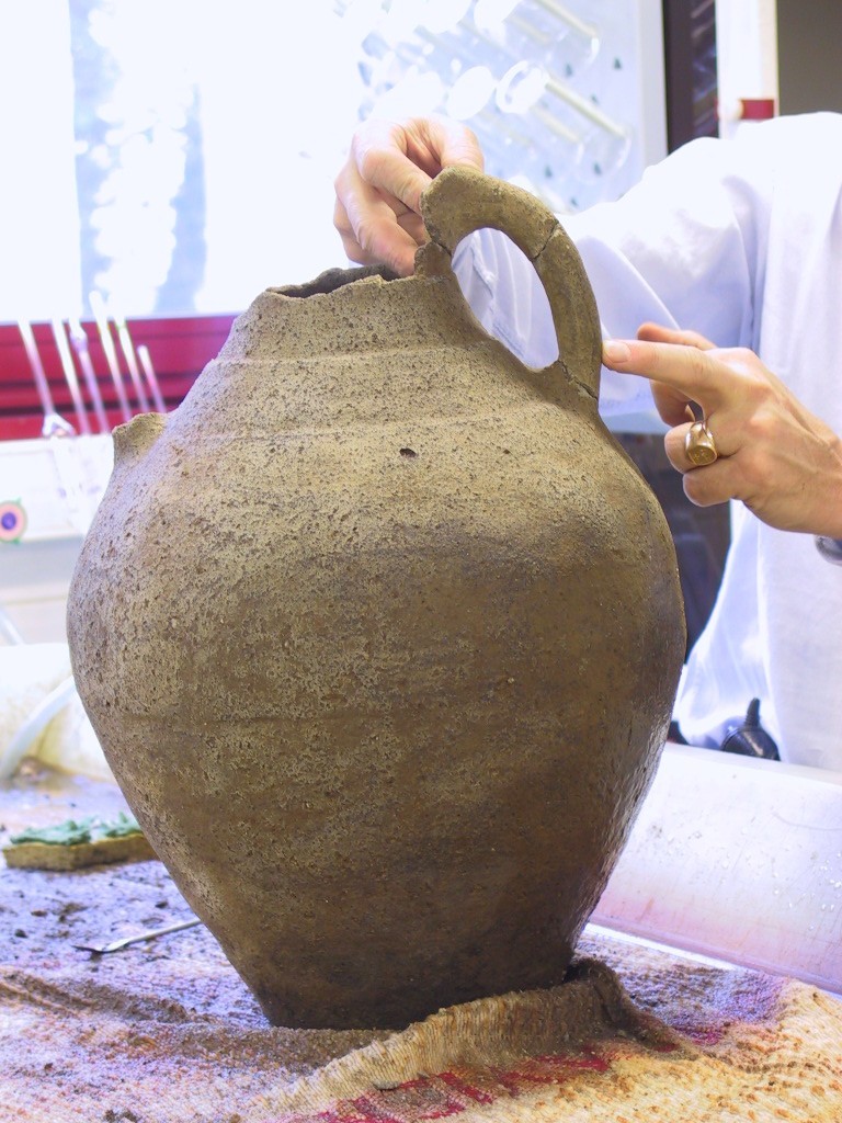 Large jar with two handles, gradually cut out then restored, deliberately maintaining the sawing of its wall.
