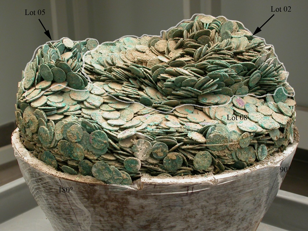 Rectangular shape of the second heap of coins, making think of the contents of a box or, rather, of a canvas bag or leather.