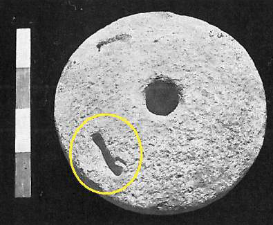 - Dormant element of medium grain granite millstone with irregular polishing, cylindrical at the base and conical cone at the top; slightly convex subvertical side and flat base. - General dimensions: diameter 45.5 cm and thickness between 9 cm (center) and 4.6 cm (side). - Angle of the grinding surface: c. 18 degrees. -Central sub-cylindrical hole vertically drilling the entire piece (diameter: 7.3). - A rectangular notch with c. 14 x 4 cm and 0.8 cm in-depth diametrically intercepts the central perforation at the base . - On the grinding surface, two concavities with a very elongated oval horizontal section are torn, with the following measures: - major concavity (where the coins were): major axis with c. 10.2; width between 1.8 and 2.3 and depths between 1.8 and 2.2; - minor concavity: major axis 8; width between 1.6 cm and 2.5 cm and an average depth of c. 1.2 cm. Silva 1990