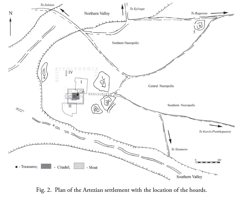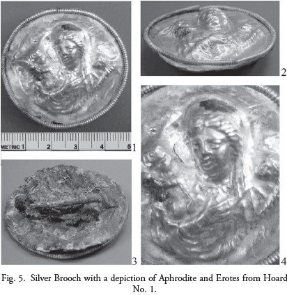 Brooch with a depiction of Aphrodite and Erotes. This assemblage contained a round silver brooch with a depiction in low relief of a bust of Aphrodite en face with two small figures of Erotes at her sides, by her right and left shoulder. The hair of the goddess is arranged at the dges of her face in a roll with diagonal notches in it conveying her tresses. On her head there is a cloak, the edges of which come down on to her shoulders. On her neck there is a necklace with pendants. The right arm of the figure on which a bracelet has been depicted is held close up against her chest. To the right of the lower edge of the figure’s bust and arranged diagonally there is a straight staff also bearing diagonal notches. Along the edge of the brooch ribbed wire has been soldered on and its ends have been joined together. A sprung fibula of a fiddle bow-shaped type has been welded on to the reverse, and a bronze coin has stuck on to it at the side. The plate of the brooch has been stamped from a thin sheet of silver. A depiction of Aphrodite and Erotes executed on a disc, is an example of the variant which had emerged in the North Pontic region in the 1st century AD, and was particularly typical for this region: the goddess has been drawn with her right hand pressed up against her chest and holding a staff or sceptre in her left hand, which is arranged diagonally and decorated with slanting notches (another iconographic type also existed, in which the goddess was not holding a staff and which can be traced back to the iconography of the Late Hellenistic period). The brooch from Artezian was most likely produced in a Bosporan jewellery workshop: it is possible that it had been made with the help of the same stamp used for the brooch from the burials in the Gorgippia necropolis dating from between the middle of the 1st century AD and the beginning of the 2nd century. 4.33 × 4.54 cm. The thickness of the plate was 0.5 mm. Maximum height of the relief – 6 mm. Wire measuring 1.6 mm. Fibula: length – 30.1 mm, the width of the spring 8.3 mm.