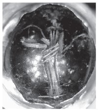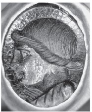Gold ring with a jet gem depicting a female head. Together with the other two rings, it had been wrapped in an offcut of a decomposed textile together with a silver ring, the corrosion of which had made them all fuse together. To judge from the microscopic fragments impregnated with oxides, it had been thin silk of very close weave. The bundle with precious rings had been fastened together with a small bow-shaped bronze fibula, which was completely corroded and which disintegrated when work began to clean it. The ring had been made using a technique customary for Bosporan jewelry in the 1st century AD – from two thin strips of gold leaf, soldered together and with a sulphurous mass between them. The ring belonged to the Bosporan School of Stone-Cutting A ring with a hollow hoop, thin at the bottom and oval in section, but broadening out towards the bezel, which is separated off from the hoop by a thin rib. The bezel is almost oval in plan, and in the centre of it there is a flat nlay also oval in plan: it is a gem with a depiction of a woman’s head facing left. The work is very delicate, and the facial features are shown in detail: the mouth, the large and slightly retroussé nose, the shape of the eye is drawn with a double line. The tresses of the woman’s hair are conveyed with thin wavy lines, drawn together in a roll, which frames the hair from below, before forming a bun at the nape of the neck. The hairstyle with a roll round the edge and a bun at the back became fashionable during the reign of Augustus85 and it was worn by Livia. Height 2.21 cm, width 2.13 cm. Bezel: 1.51 × 1.71 cm, overall thickness complete with inlay 4.3 mm. Inlay: 1.49 × 1.15 cm. Hoop: measures in section at the bottom 1.2 × 2.1 mm, width at the top 6.3 mm, thickness 2.4 mm.