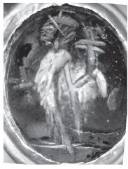 Gold ring with gem depicting Nemesis. Together with the other two rings, it had been wrapped in an offcut of a decomposed textile together with a silver ring, the corrosion of which had made them all fuse together. To judge from the microscopic fragments impregnated with oxides, it had been thin silk of very close weave. The bundle with precious rings had been fastened together with a small bow-shaped bronze fibula, which was completely corroded and which disintegrated when work began to clean it. The ring had been made using a technique customary for Bosporan jewelry in the 1st century AD – from two thin strips of gold leaf, soldered together and with a sulphurous mass between them. The ring belonged to the Bosporan School of Stone-Cutting. On the gem, standing Nemesis is depicted with her head shown in profile facing left, but with her body facing forward and holding palm branches. The folds of her garment at the waist are conveyed with three thin and almost parallel, vertical notches. Height 2.19 cm. Maximum width 2.14 cm – Bezel: 1.41 × 1.50 cm, thickness with the inlay 5.3 mm. – Inlay: 1.08 × 1 cm. – Hoop: in section at the bottom 1.1 × 1.5 mm, width at the top 6.5 mm, thickness 2.1 mm.