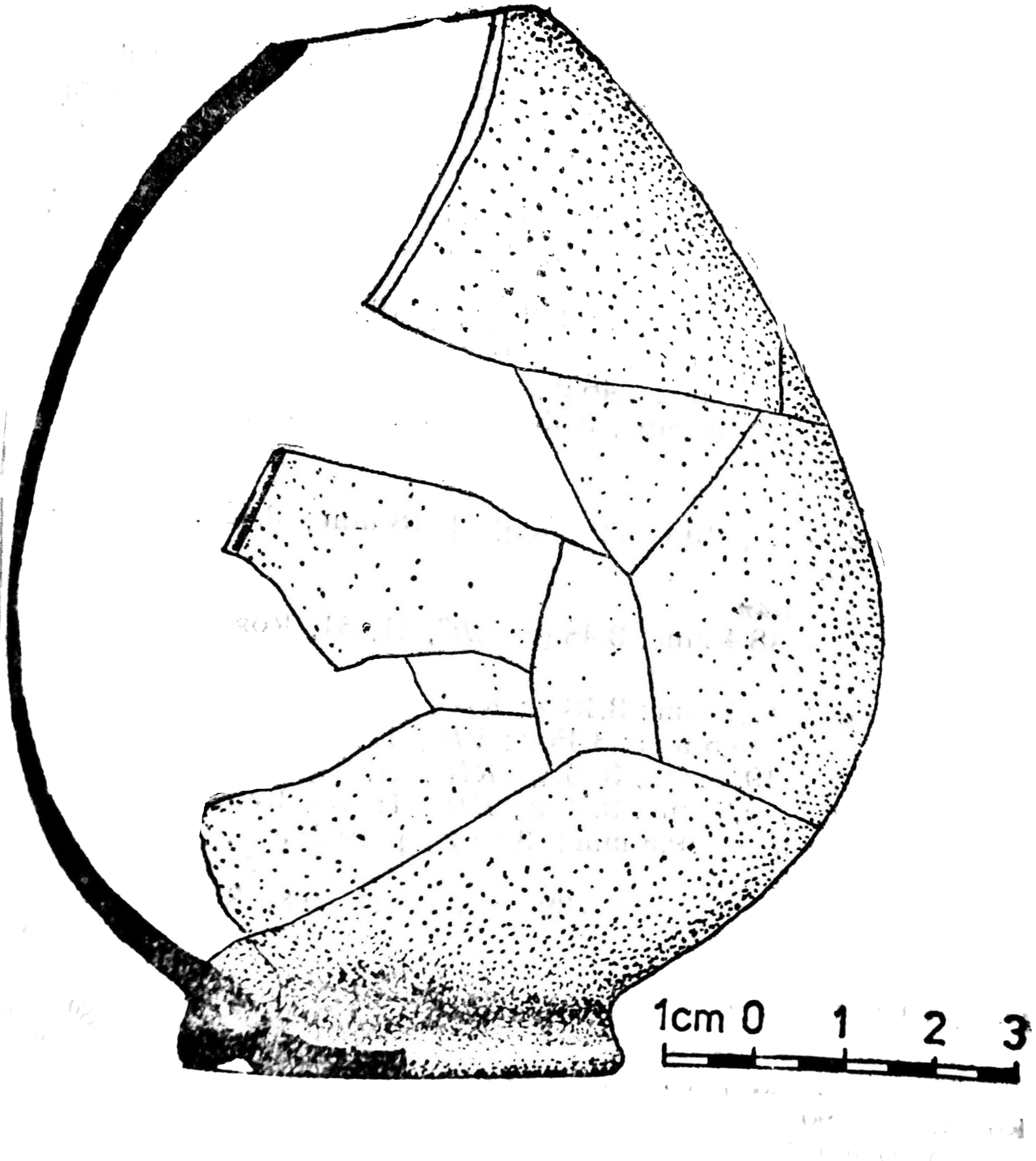 Broken at the time of discovery. The vessel with one handle was wheel-made from a fine paste of red-orange colour. The bottompresents a supporting ring, while the body has a bi-tronconic shape. H: 11.7 cm; Bottom doameter: 4.9 cm; body diameter: 10.1 cm; Neck diameter: 2.6 cm It was deliberately cut to be transfomed in a money-box by cutting the neck and the handle.