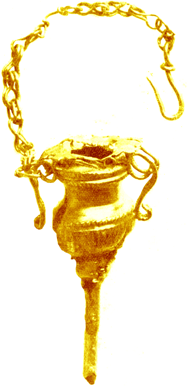 A fragment of a gold amphora-shaped pendant measuring 40mm in length.