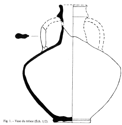 Fragments of a ceramic vessel were found on the surface along with the base of a ceramic vessel at a depth of 40cm. Two-handle jug of light brown colour, type Gose 412. H: 25 cm