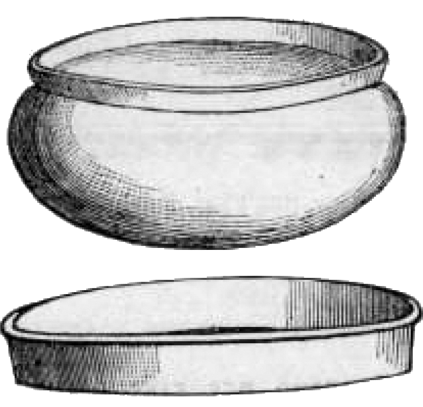 H: 10 cm; Dmax: 24.2 cm; Drim: 22 cm. It was covered by another bronze recipient with straight edges, which served as lid.