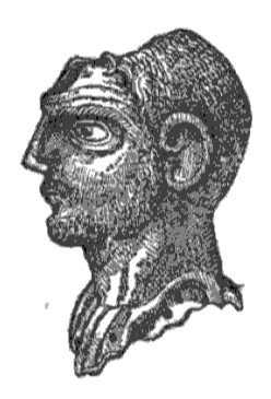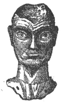 Small gold male bust. Hollow inside. It was fixed on a support. Repoussé in a meticulous way, particularly the eyes, the eyebrows, the beard and the hair. The ears and eyes are disproportionate, the forehead strongly wrinkled, the nose puffed up, the nostrils wide, the beard and the hair short; Adam's apple is prominent. A heavy blow was applied to the upper part of the head and completely smashed it. Below the neck, broad and strong, probably, the top of a garment pierced with nine holes for fastening the gold casing to the bracket.