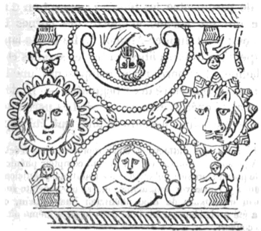 Rolled gold band, without traces of welding, covered with reliefs obtained by repoussé. There are eight medallions separated from each other, from axis to axis, by a space of 4.8 cm. They alternately contain a lion's muzzle and a beardless human head, so that there are four men's heads and four lion's muzzles. The first ones are placed in a round frame surrounded by a rounded scalloping; the frames of the seconds are edged with a pointed scalloping and each point, at its base, is accosted by two pearls. Above and below each of the medallions is placed a little winged Cupidon sitting on the edge of a basket. These cupids are arranged in such a way that the bases of the baskets rest on the lower border and on the upper border of the band. Thus, among these cupids, some are placed in the direction of the heads of the medallions, others with their backs to them. The interval between each medallion is filled by two arches open in opposite directions and approaching by their summits; they take the form of two back-to-back amazon shields (peltae); they are edged with line pearls. Under each arch is a bust, either bearded or hairless. The flattening state in which the headband is located does not make it possible to recognize the heads, with the exception of one which is bearded and has very visible horns: Jupiter - Ammon. Small rabbits occupy the free spaces between the arches and the medallions. The borders consist of a twist held between two sticks. The pearls are made with the perloir. Several details were made by a chisel, in particular the hair and beards as well as the hair of the rabbits.