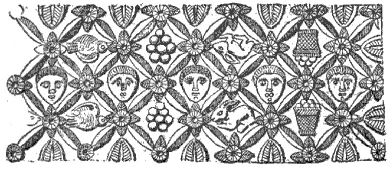 Part of a gold bracelet bearing a rather complicated decoration, executed in repoussé, with a strong relief. The base consists of a regular seedling of rosettes with four elongated leaves. These rosettes are arranged so that their leaves form the frames of small diamond-shaped compartments, simulating three horizontal bands. In the middle band, these compartments are filled with seven rather roughly rendered hairless heads. The eyebrows and eyes have been drawn back; the mouths are made alternately with a stroke of a burin and two strokes of the pearl. The other diamonds are occupied in turn by baskets of fruit, rabbits, bunches of grapes and birds. These subjects, placed in pairs above and below the heads, face each other in opposite directions, so as to always have the lower edge or the upper edge of the bracelet as a base. Rabbits and bunches of grapes are repeated twice. Eighteen palm leaves complete the decoration. The heart of each rosette located on the top of the compartment lines returns to the field of the heads with the help of four small palmettes indicated in engraving, which form like the petals of an open flower of which the heart of the rosette would be the center. On the edges, the metal is slightly folded so as to form a border decorated with a regularly repeated line. At each end, there is a small opening in which a hinge pin fits.