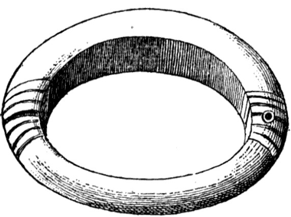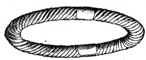 Jet (or black glass paste) bracelet, perfectly round in shape; it is cut into a twist. Two small gold ribbons, 19 mm wide, are applied to two opposite points of the bracelet, wrap it tightly in the shape of twist and form two symmetrical flat necklaces. This peculiarity would make believe that the object is in two pieces and that the gold leaves were applied to join them.