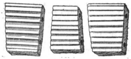 Six small jet (or black glass paste) pieces. Decorated with horizontal grooves and each pierced with two parallel holes in the direction of the grooves. Three of these plates are 2.2 cm long; the other three are only 2 cm.