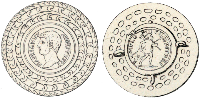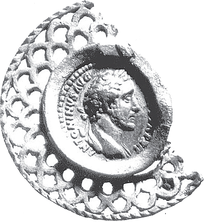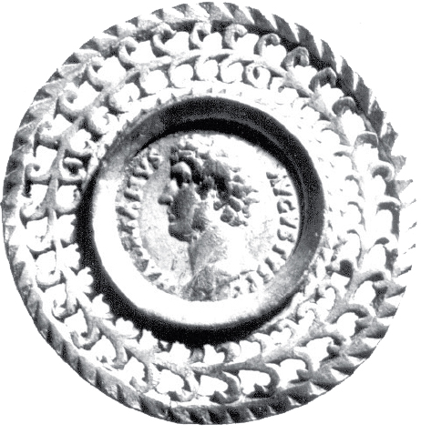 Mounted aureus of Hadrian. HADRIANVS AVGVSTVS P P, Bust of Hadrian, bare-headed, draped, left ROMVLO CONDITORI, Romulus, advancing right, holding spear in right hand and trophy in left RIC, 370; OCRE ric.2.hdn.370 Dating aureus: 134-138 Mpounted into a circular fretted frame with fleur de lis decorative motifs