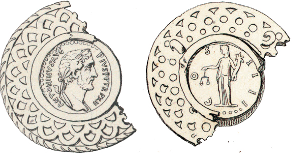 Mounted aureus if Antoninus Pius. ANTONINVS AVG - PIVS P P TR P XII, Head of Antoninus Pius, laureate, right COS - IIII, Aequitas, draped, standing left, holding scales out in right hand and cornucopiae in left Dating aureus: 148-149 RIC, 177d; OCRE ric.3.ant.177d_aureus Mounted into a circular fretted frame of ogives decoration with four links. Fragmentary