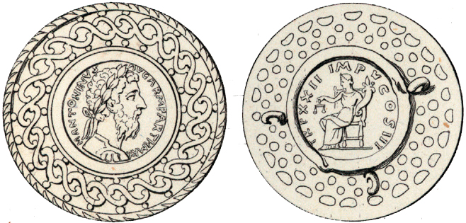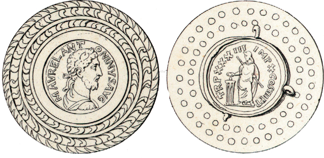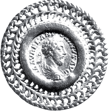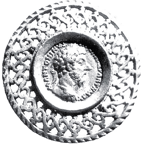 Mounted aureus of Marcus Aurelius. M ANTONINVS - AVG ARM PARTH MAX, Bust of Marcus Aurelius, laureate, cuirassed, right TR P XXII IMP V COS III, Aequitas, draped, seated left on low seat, holding scales in right hand and cornucopiae in left hand Dating aureus: 168 RIC, 190; OCRE ric.3.m_aur.190 Mounted into a circular fretted frame of curvev lines decoration with three links. Fragmentary