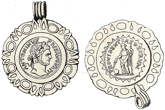 Mounted aureus of Caracalla. ANTONINVS PIVS AVG BRIT, Head of Caracalla, laureate, bearded, right PROVIDENTIAE DEORVM, Providentia, draped, standing left, holding wand in right hand over globe and sceptre in left hand Dating aureus: 210-213; Rome RIC, 227; OCRE, ric.4.crl.227_aureus Mounted into a circular fretted frame with pearls and ogives decoration and a loop attached