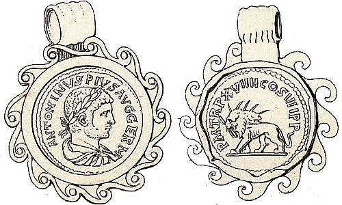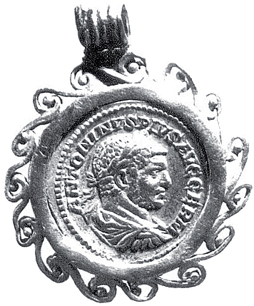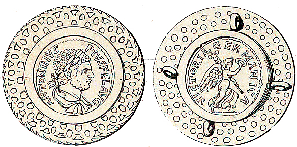 Mounted aureus of Caracalla. ANTONINVS PIVS FEL AVG, Bust of Caracalla, laureate, draped, cuirassed, right VICTORIA GERMANICA, Victory, winged, draped, advancing right, holding wreath in extended right hand and palm sloped over left shoulder in left hand Dating aureus: 213; Rome RIC, 237; OCRE, ic.4.crl.237_aureus Mounted into a circular fretted frame and four links