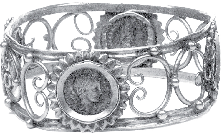 Bracelet of gold wires decorated with 'pelta'-shape wires. Four mounted aurei: Marcus Aurelius, Caracalla, Gordian III, Claudius II