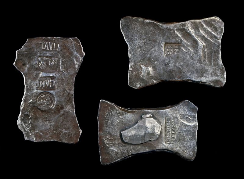 Inscribed Silver ingot 1, inscribed ‘CAND’ & ‘PAVLI’, Roma with ‘VRBS ROMA’, and a portrait stamp showing a facing imperial bust next to two cheek-to-cheek busts. Wt.: 299.73g.