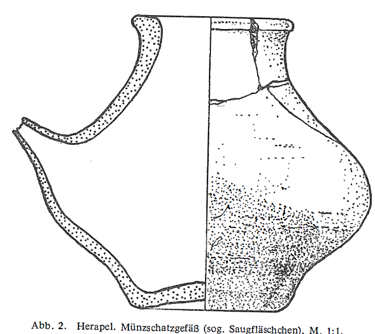 Reddish clay vessel, 7 cm high and 8.5 cm at its widest point, which is blackish in colour in some places due to firing. It belongs to the group of so-called lamp fillers. (Franke-Leschorn 1976, Abb. 2).