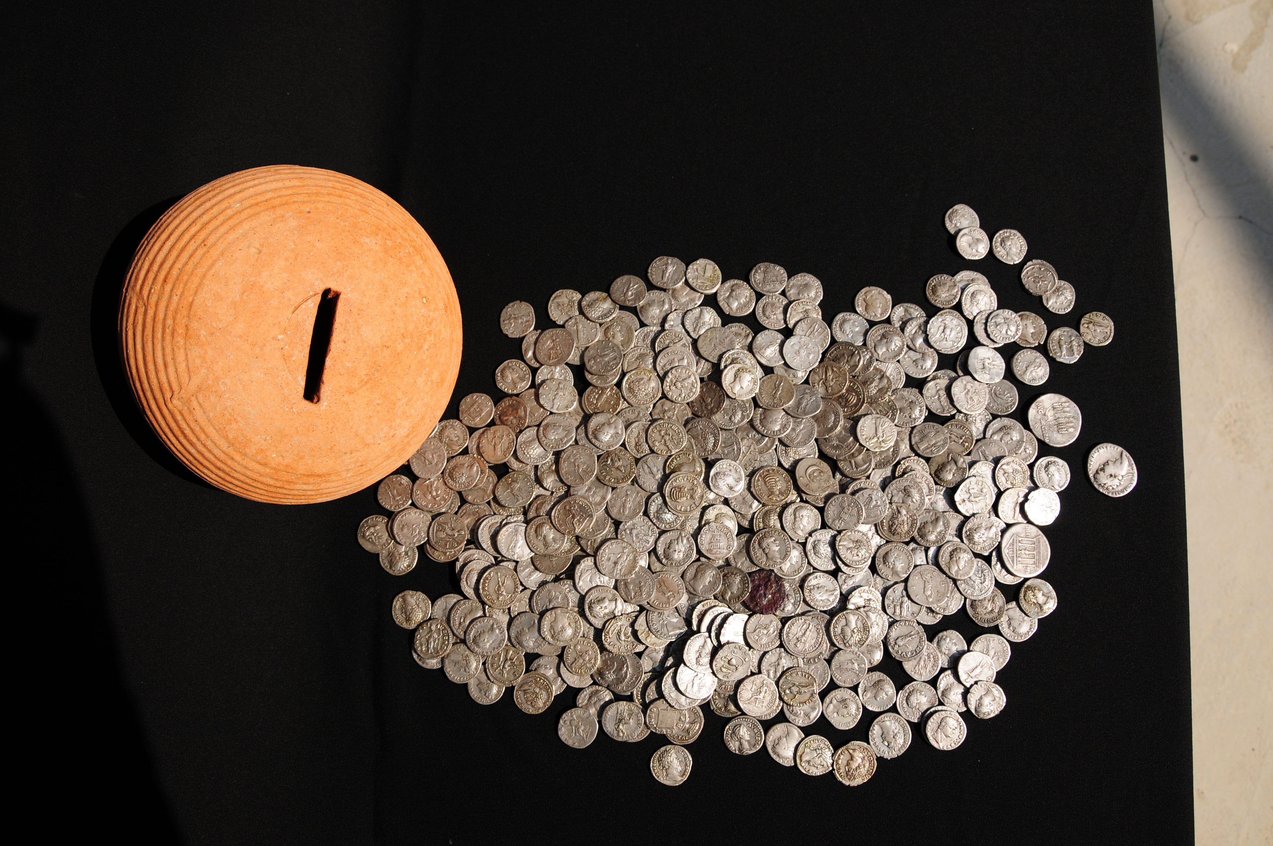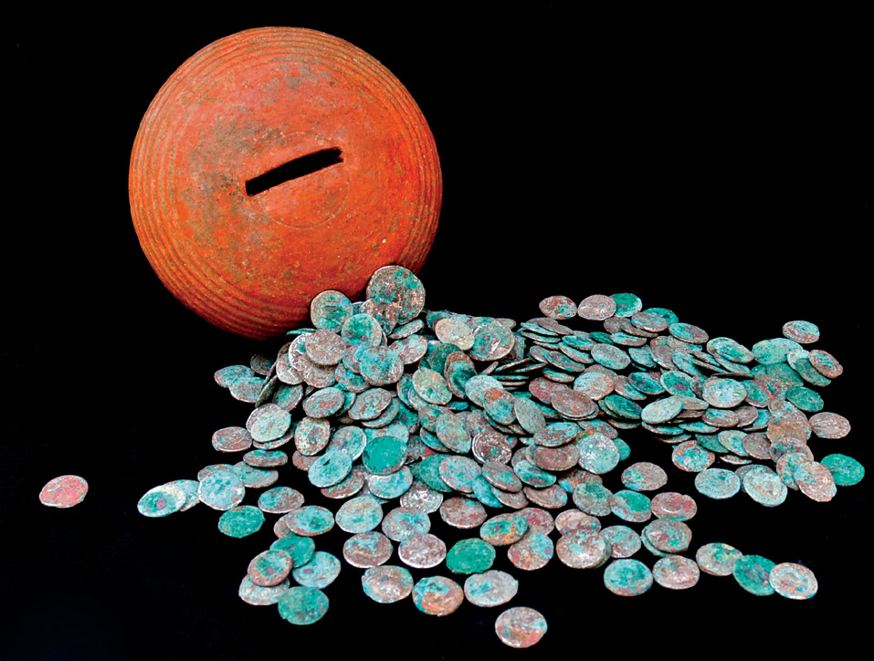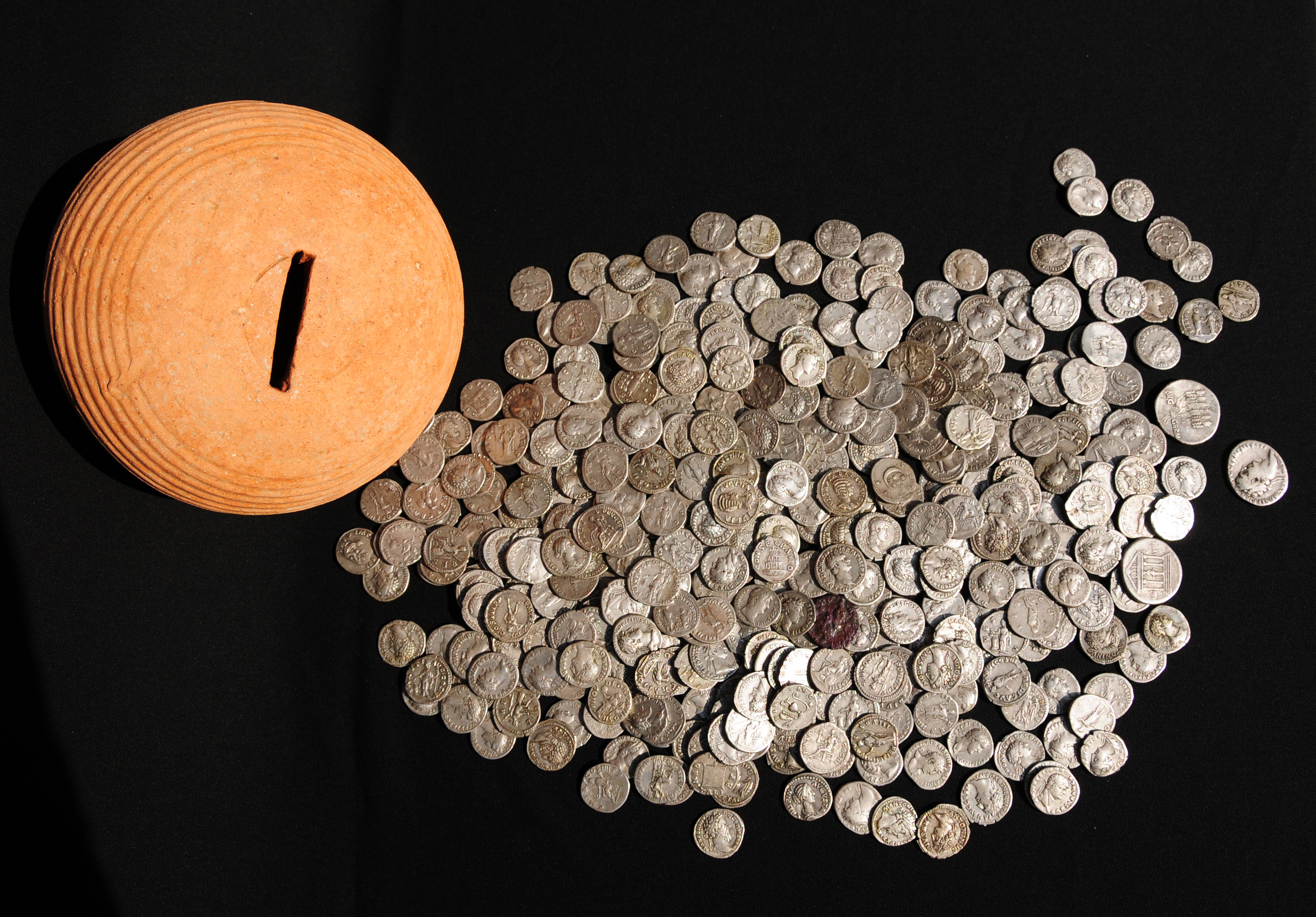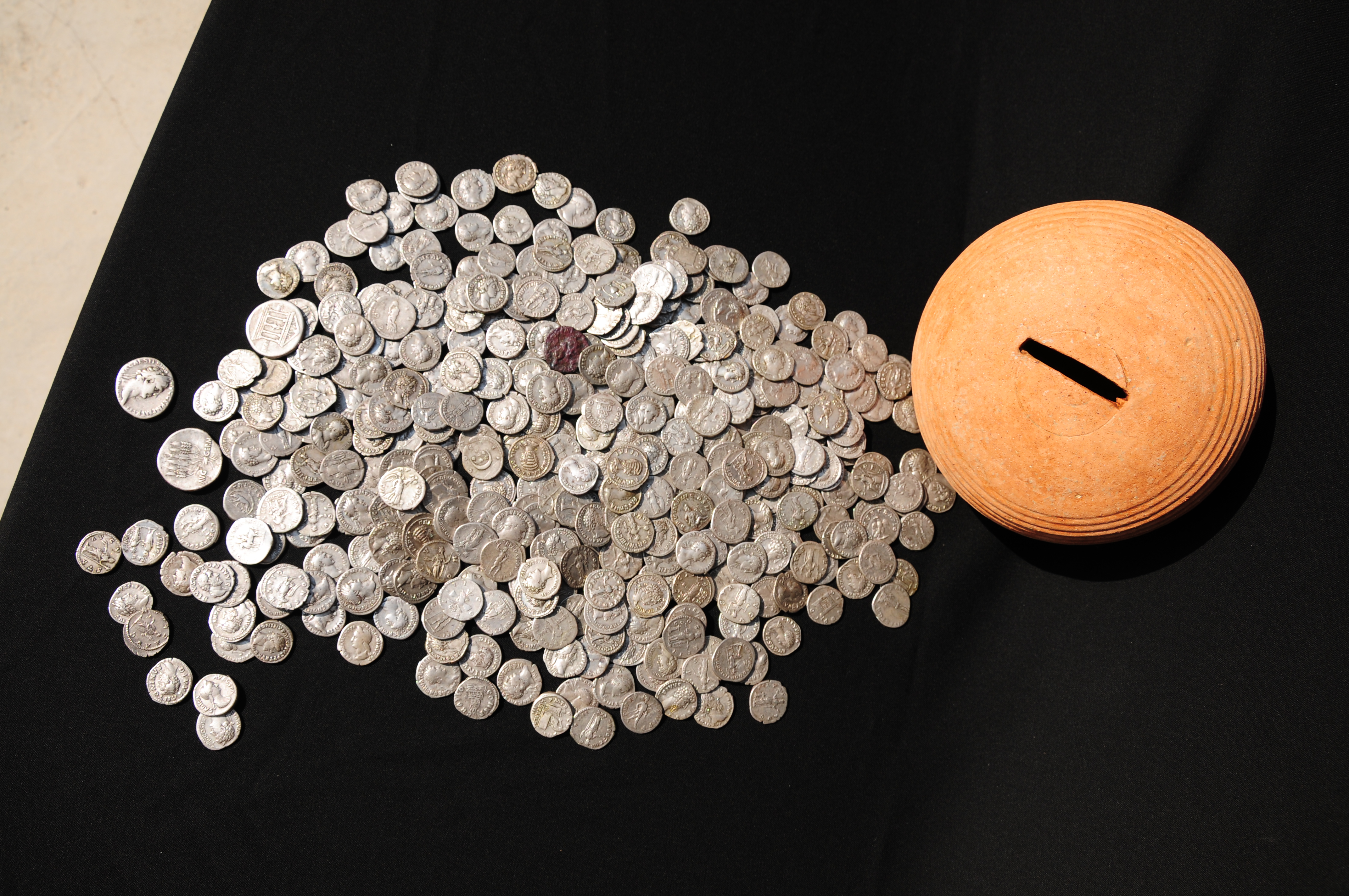 The hoard was found in a complete red ceramic moneybox. The moneybox was circular in shape with a rectangular slot on its upper surface.