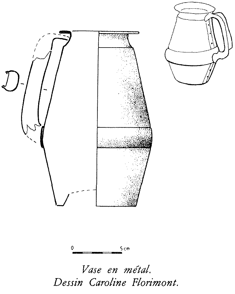 A copper-alloy barrel-shaped container, constructed from sheet metal and measuring 18.7cm in height. Diameter 11 cm. It was closed with a fragment of tile.