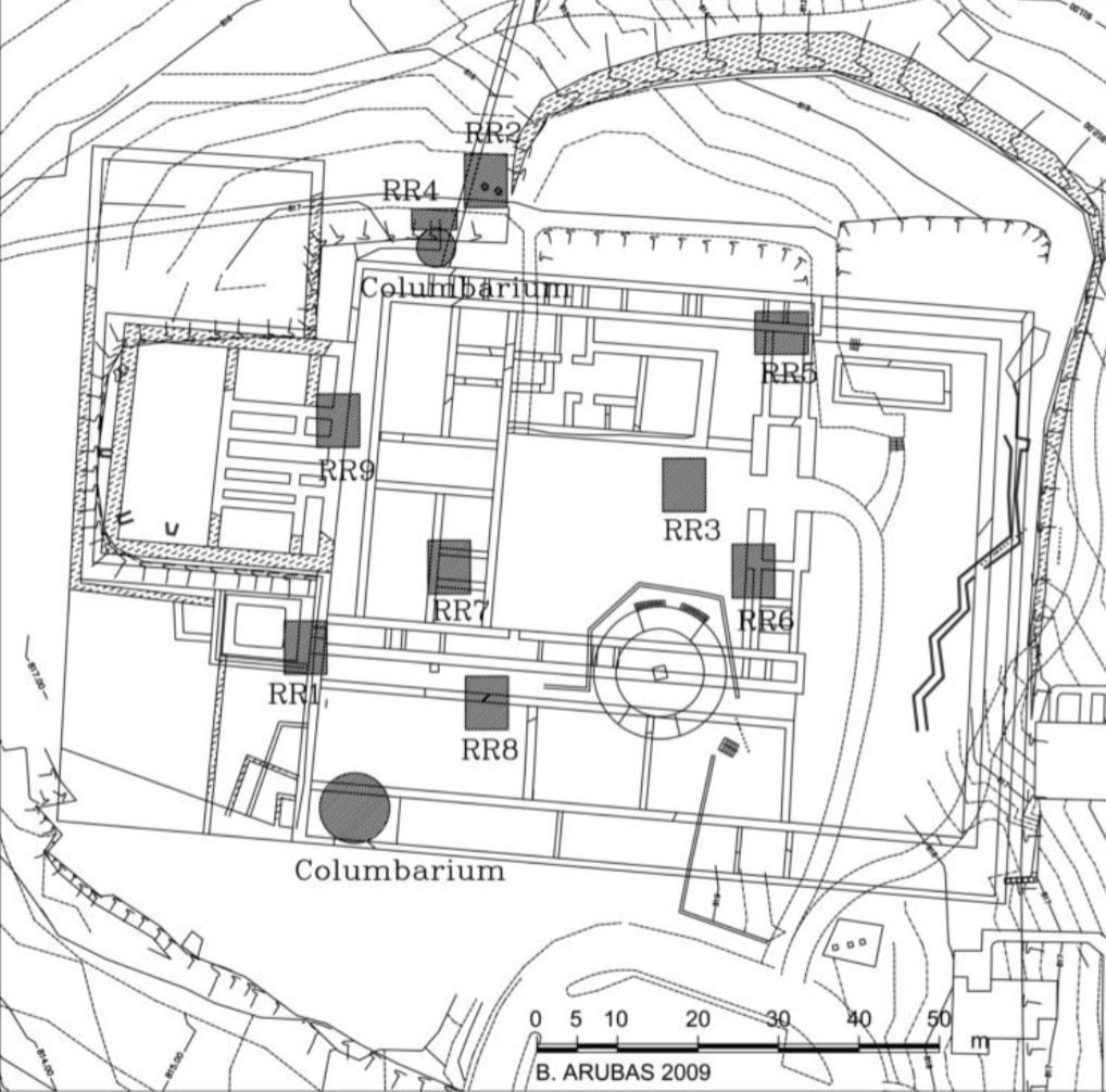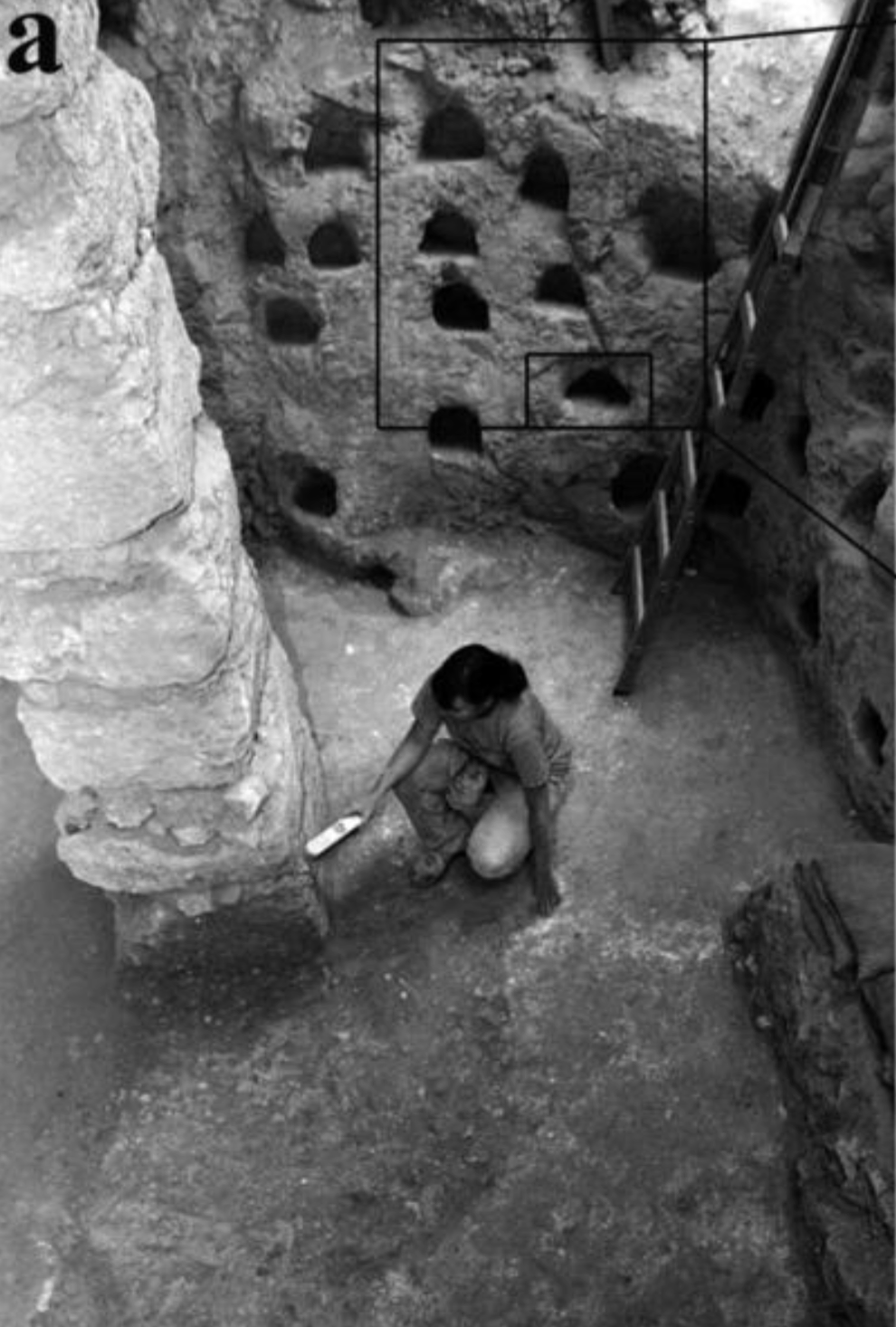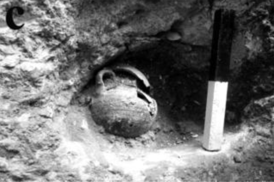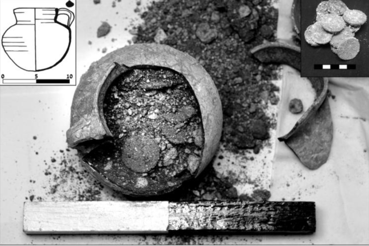 The cooking pot was covered with the broken base of a jug (or juglet) that served in secondary use as a lid. It was filled up to the rim with light-brown sediment, which covered the coins. It seems that the sediment had penetrated into the pot through the cracks by means of post-depositional processes. The pot was on top of a thin (3–4 cm) layer of sediment that covered the bottom of the niche. The cooking pot belongs to a type of small, closed pots with a simple, outward- sloping rim, a flaring, convex neck, a squat, globular body, a convex, pointed bottom and one vertical handle extending from rim to shoulder. (Farhi et al. 2010, 62)