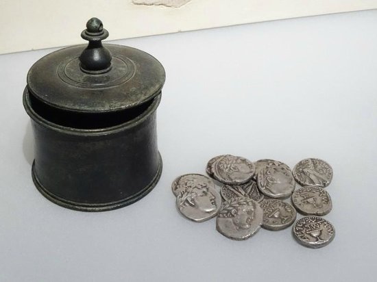 The diameter of the pyxis is 7.5 cm and the height including the lid is 9 cm. Photograph: Israel Museum. 'The pyxis is of bronze and has acquired a beautiful greenish-blue patina... The cover of the pyxis has a pierced handle. The workmanship is excellent, and the cover fits perfectly, which probably accounts for the good preservation of the coins. The pyxis rests on a moulded ring base at the circumference, and the bottom is reinforced by a sort of metal stud riveted to the centre.' (Reifenberg 1945, 83)