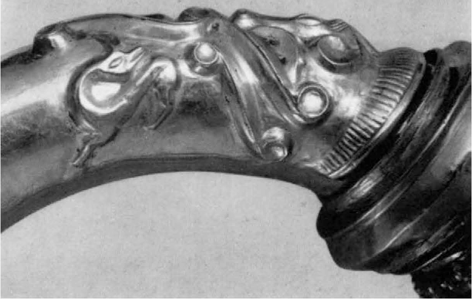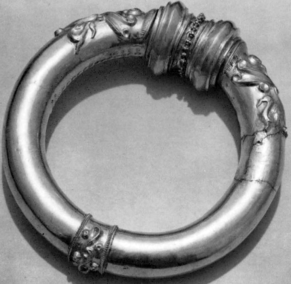 Large torc. "It is formed on an iron ring core which is covered with a stiff paste of beeswax and resin, over which the thin "gold" shell was placed. The shell, mainly an alloy of gold with some silver, is more properly identifiable as electrum. The torc open laterally and may be pulled open to form two halves, separated on the axis of the terminal buffers on the frontal side and the simple rings at the back. The buffers are enhanced by subordinate moldings and, at the center, by a delicate ring with beaded elements. 8 Both frontal surfaces are embossed with symmetrically matched reliefs of animal and geometrical designs. The dorsal ring is also embossed with a simpler motif. The composition of the frontal reliefs consists of a ram's head with volute horns as the central element, framed at the sides and below by elongated S-scrolls which meet on a center line and flow into each other, constituting "lyre" patterns. A pair of contorted animals, whose heads are turned backward, flank the lower scrolls." Diameter of tube: 12.7 cm; thickness of gold shell 0.0026 cm.