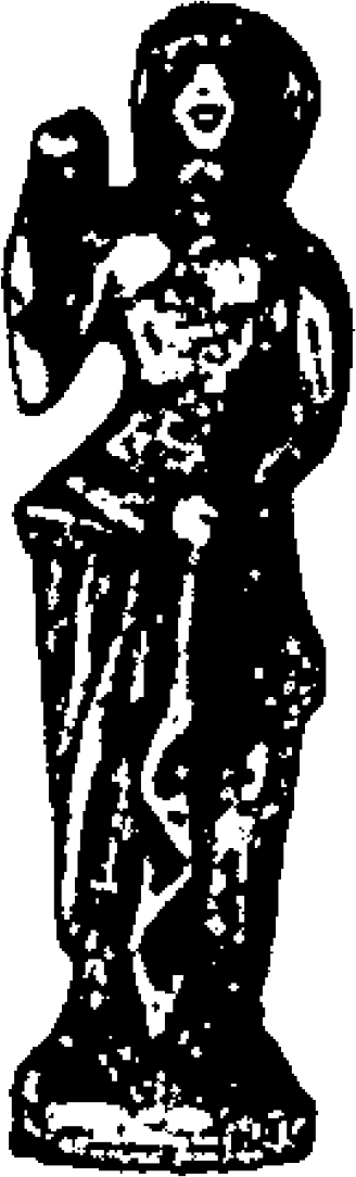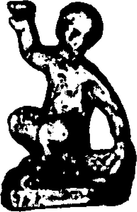 Statuette of a Satyr, naked, sitting on a rock, with his right hand raising a cup.