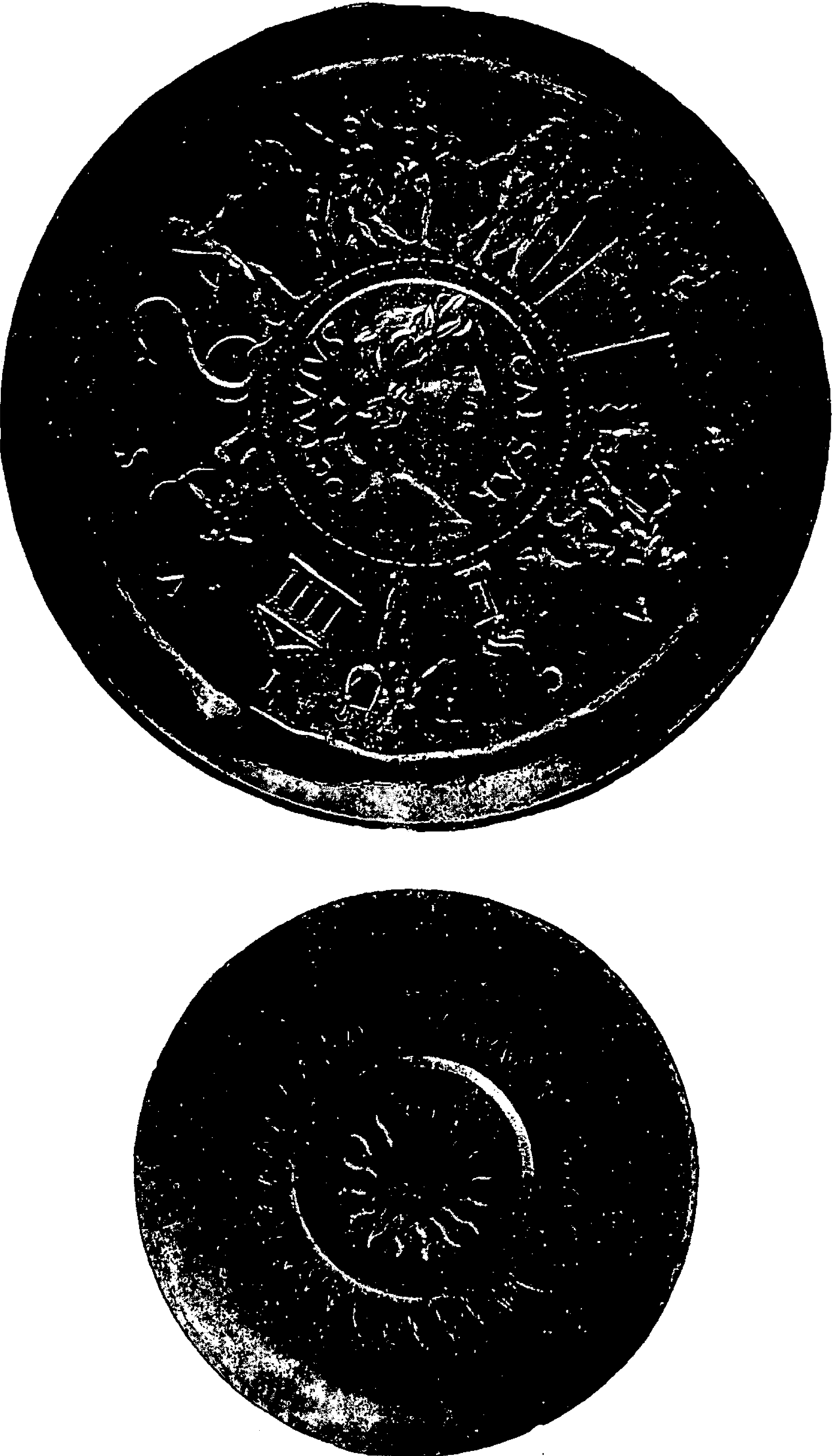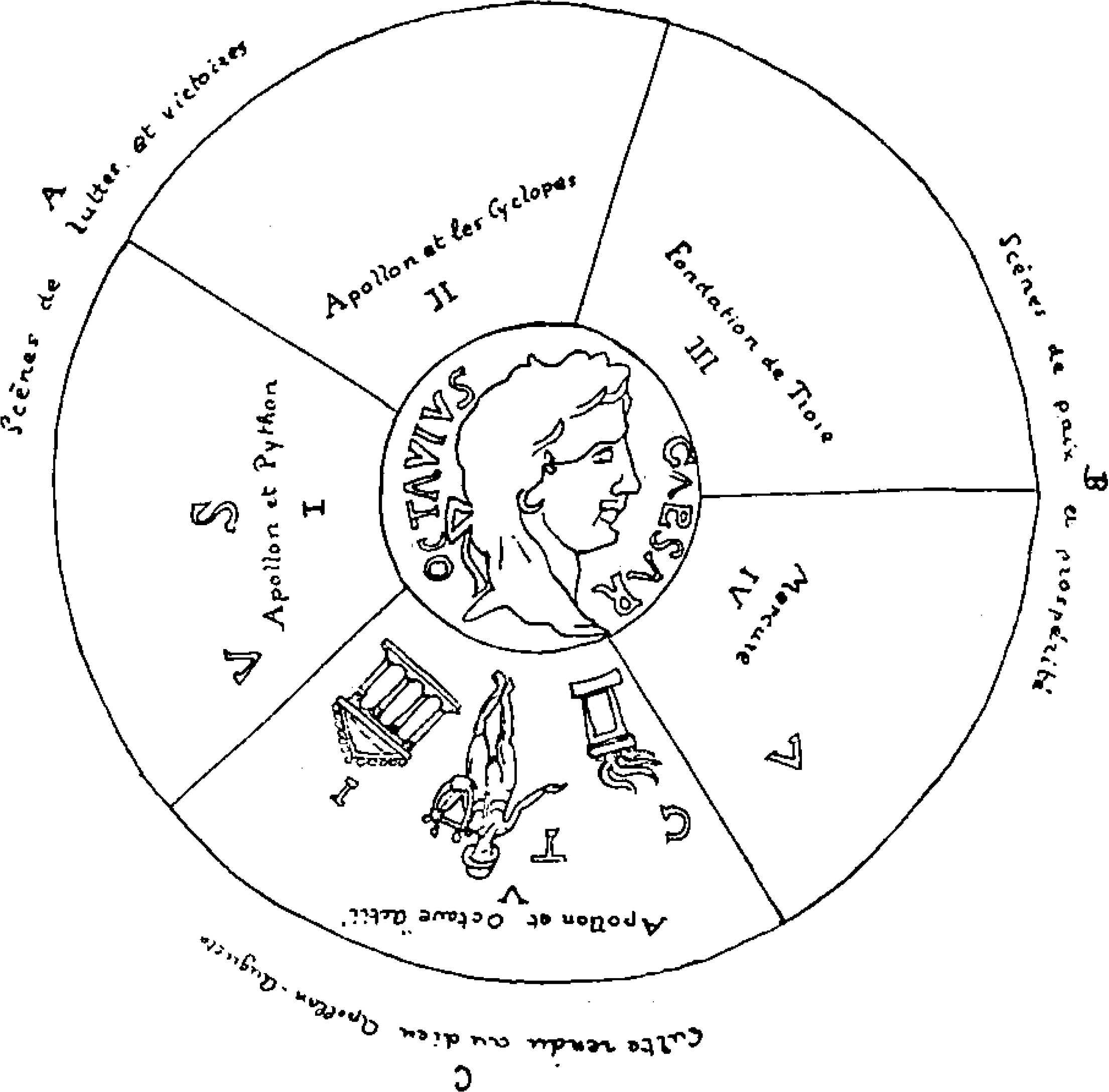 One large silver pan (patera). Decorated with scenes from th life of Apollo. The recipient was turned up side down to protect the other objects On the obverse, in the middle, a medallion with the head of Octavian, laureate, right. The two words of the inscription in relief, OCTAVIVS CAESAR, are arranged symmetrically on each side of the. portrait. A snake describes a circle around the edge of the cup, with the head touching the tail. Between the central medallion and the serpent runs a frieze with motifs relating to the myth of Apollo, Neptune, Mercury, and the inscription in relief, ACTIVS. On the reverse side, the circular base on which the cup rests is surrounded by a crown of petals, and encloses in its middle a great flaming sun, which stands out against a gray background. It bears the inscription: V.S.C.P.// II / XII.. The various scenes which compose the circular frieze between the serpent and the central medallion, run from left to right, clockwise, according to the principle of the Indo-European arts. The initial point is fixed by the head of the serpent and the point terminus by its tail, above the temple of Apollo, motive towards which all the others converge. One sees succeed A. Scenes of struggles and victories. I. Apollo against the serpent Python. II. Apollo against the Cyclops. B. Scenes of peace and prosperity. II. Apollo and Neptune found the walls of Troy. IV. Mercury sitting, god of abundance. C. Cult rendered to Apollo Actius. V. Apollo with lyre, altar, temple, and the inscription ACTIVS.