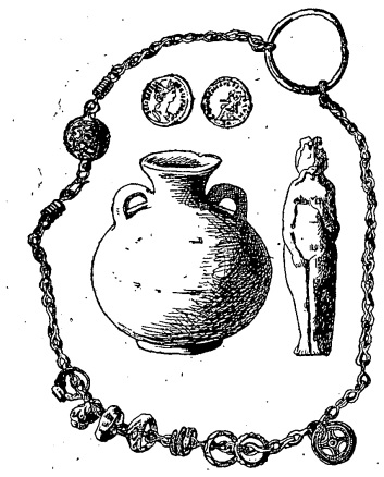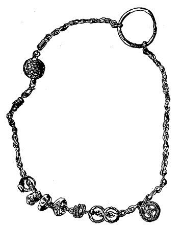 The chain, long of 85 cm, consists of links of a very fine technique. They are "formed of a ring folded twice on itself along two perpendicular planes. The welding of each ring was made after the coupling in series, then each link folded and then reopened with a mandrel following two planes at right angle ". The chain ends at each end with a cylindrical barrel, decorated with concentric moldings and extended by a rotating ring. The circular plate (diameter 2.7 cm) is linked to one of these barrels with a hook inserted in the ring of the other barrel. This plateau, strongly domed, with a narrow flat edge decorated with concentric circles, crimped in its center, currently empty, a glass or enamel. On the convex part, they are lines in relief, describing S and C, namely five Cs supported by their curvature in the central void, and five S around. On the opposite side of the clasp, a four-pointed rosette (diameter 2.7 cm) is attached to the chain by a twisted wire. Its circumference is made of concentric circles alternately smooth and striated. At the closing point of the four spokes rises a central button.
