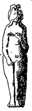 Statuette of Venus Pudica. Made of white-terracotta. The face is turn to his right. The goddess, standing with her legs together, covers her breast with left hand and her gender with right. A drapery falls from the left shoulder to the feet, without concealing the body.