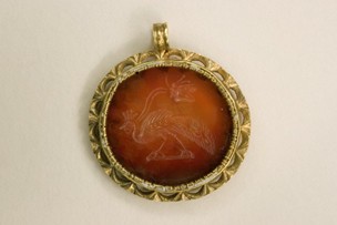 A circular engraved sardonyx pendant with a gold mount. The engraved sardonyx depicts a peacock standing left, with a butterfly above. The mount is openwork in design with the decoration comprising a pattern of alternate semi-circular open arcs and solid triangles, derived from a Classical palmette motif. The inner circumference of the mount is decorated with an irregular beaded pattern. A suspension loop with double-grooved decoration extends from one end. The style of decoration exhibited by this pendant is most common in the third century AD.