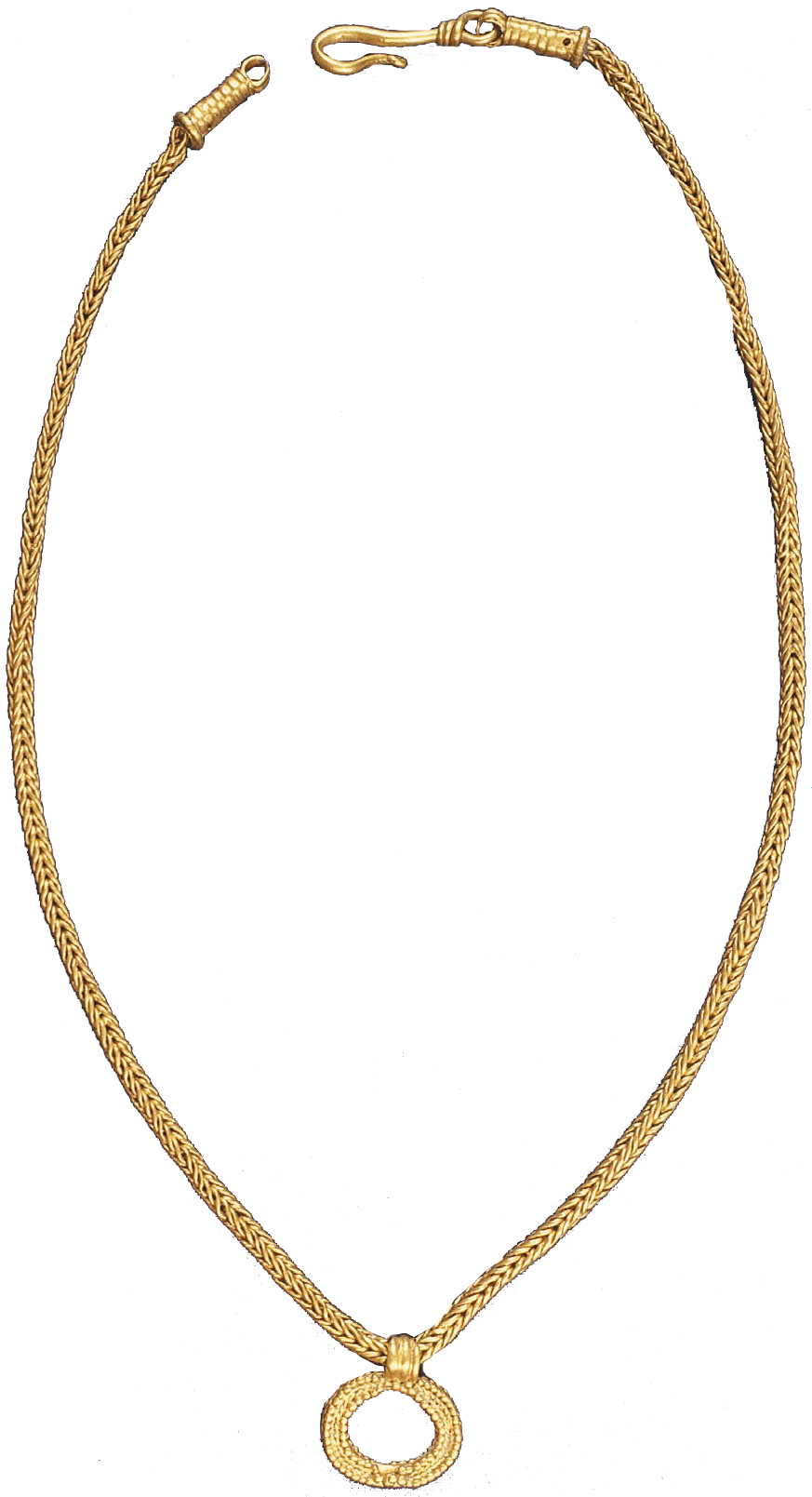 Golden necklace, 'formed by a multiply twined chain and a lunular pendant. The chain is massive and compact, woven so that each double loop is pulled through the previous two. This manner of weaving is called "loop in loop", and the result is a "plaited" chain, the one in