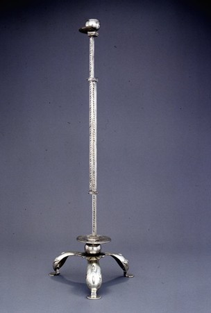 An incomplete silver candlestick, belonging to class of articulated candlesticks, whose height is adjustable. The uppermost part of the candlestick is incomplete. It comprises a disc-shaped plate on which rests a spherical element. A cut-out at the top of this spherical element indicates where the candle would originally have been fixed. The main body of the candlestick comprises two square-section rods, which can be moved up and down to alter its overall height. A pin allows the two rods to be fixed together at the appropriate height. Three small holes indicate three possible heights. The entire length of the principal face of each rod is decorated with an incised wave motif, filled with niello. The rods are separated from the foot of the candlestick by a flat, circular plate beyond which is an undecorated spherical element. The candlestick is supported by three feet in the form of dolphins. From the beaks of the dolphins, there extend three flat pelta-shaped plates which may represent schematic seashells. The eyes are rendered as two concentric incised circles, filled with niello. The fins are rendered in relief. The lateral fins are decorated with small incised parallel lines filled with niello. The candlestick was bent in three when discovered.